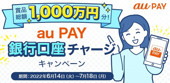auペイメントとKDDIは、2022年6月14日から2022年7月18日まで、「賞品総額1,000万円分!au PAY 銀行口座チャージキャンペーン」(以下 本キャンペーン)を開催します。