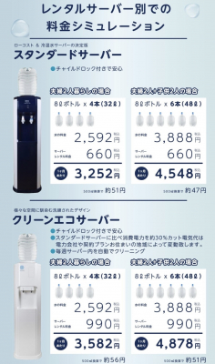 「ウォーターポイントMineral Pure Water(ミネラルピュアウォーター)」は、こうした様々なコスト削減により、648円(8リットルボトル)という業界最安値※5の販売価格を実現しております。1カ月あたりの最低利が1,956円(税込)※6の「スタンダードサーバー」と、省エネ機能と自動クリーニング機能を搭載した「クリーンエコサーバー」の2種類です。ご家族の人数に応じて、配送本数が変更できます。