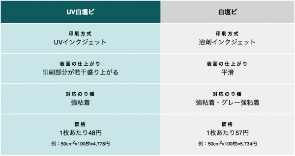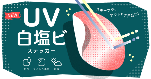 「UV白塩ビ」は耐水性・耐候性に優れた白塩ビ(PVC)素材にUVインクで印刷する新しい商品です。従来の「白塩ビ」と比較して耐候性は同等で、販売価格が安く大変お得な商品です。例えば10平方cmのサイズのステッカーを100枚ご注文いただいた場合は、1枚単価20円です。