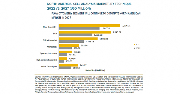 細胞解析の市場規模は、2022年の177億米ドルからCAGR10.1%で成長し、2027年には286億米ドルに達すると予測されています。細胞ベースの研究活動に対する資金調達の強化、創薬における細胞ベースアッセイの採用、創薬活動の増加などが、細胞解析市場の成長を牽引しています。細胞ベースのアッセイアプリケーションの拡大、COVID-19パンデミックの発生、新興国による有利な機会の提供などが、市場成長をさらに後押ししています。一方、洗練された細胞解析装置の高い価格設定と、試薬の使用に関する制限が、市場の成長を制限することが予想されます。