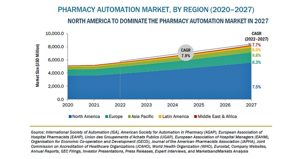 ファーマシーオートメーション(薬局自動化)の市場規模は、2022年の56億米ドルからCAGR7.9%で成長し、2027年には82億米ドルに達すると予測されています。これは、人件費削減のための自動化への注目と、特殊薬剤調剤の増加によってもたらされています。また、ファーマシーオートメーション企業は、新興国でのプレゼンスを拡大することで、新たなビジネスチャンスを求めています。しかし、システムの導入にかかる高コストと、製品の発売を遅らせる厳しい規制が、市場の成長を抑制する可能性があります。