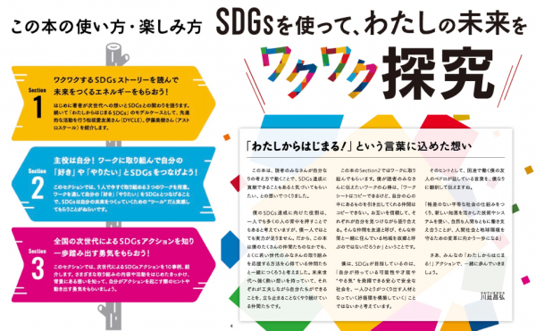 SDGs の 17 のゴールといわれても、僕には関係ない・問題が大きすぎて私には無理と感じる人も多いと思います。一方で、好きなこと・思いがあることなら夢中になれるし、頑張れます。自分の好きや想いを SDGs とつなげて考えることが、自分や自分の周りの世界とつながるきっかけになるとしたら?新しい未来への第一歩になるとしたら?自分にもやれそうな気がして、なによりちょっとワクワクしてきます。本書掲載Section2のワークは、そんなワクワクを体験してもらうためのものです。自分の「好き」や「想い」からワクワクする未来がきっと見えてきます。