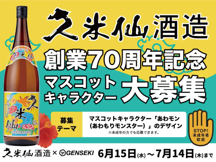 久米仙酒造株式会社(所在地:沖縄県那覇市 代表取締役:比嘉洋一)は、創業70周年を記念してマスコットキャラクターを募集するイラストコンテストを2022年6月15日より開催しています。