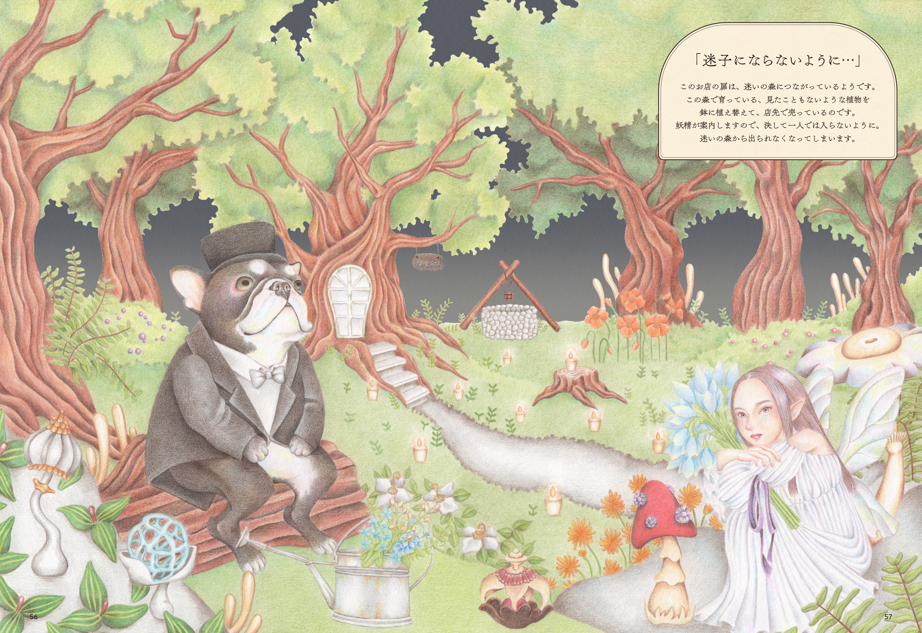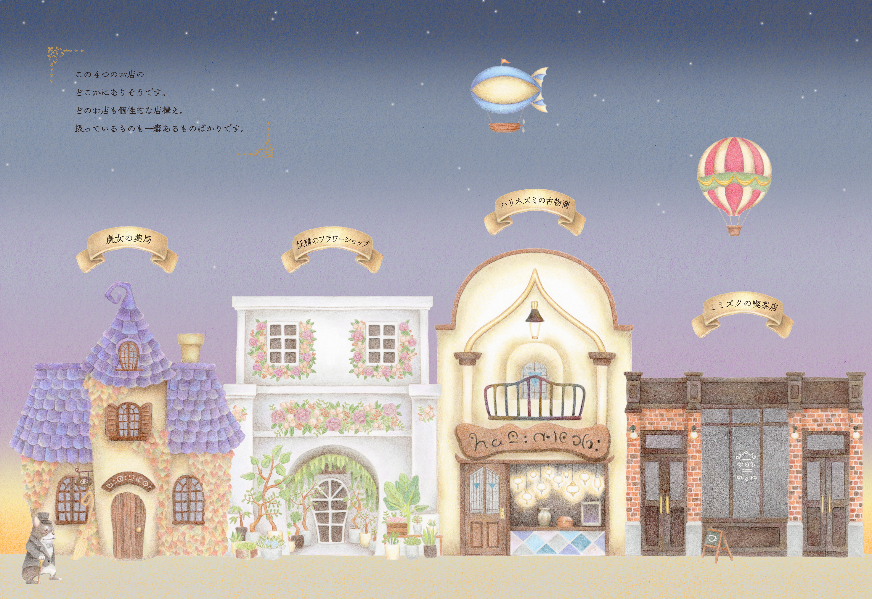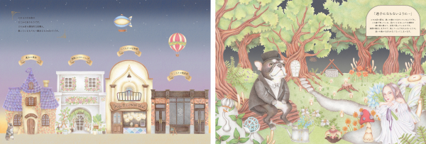 商店街には「トカゲの魔女の薬局」「妖精が見守るフラワーショップ」「ハリネズミの古物商」「ミミズクの喫茶店」と4つの店があり、どのお店にも不思議なアイテムが並びます。