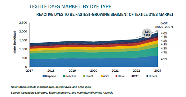 テキスタイル用染料の市場規模は、2022年の111億米ドルからCAGR4.6%で成長し、2027年には140億米ドルに達すると予測されています。多様な産業におけるテキスタイル用染料の使用拡大、都市化人口の増加、衣料品産業における需要の増加が、テキスタイル用染料の需要を促進しています。