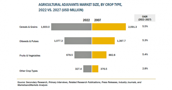 農業用アジュバントの市場規模は、2022年の37億米ドルからCAGR5.2%で成長し、2027年には47億米ドルに達すると予測されています。アジュバントソリューションの、植物の葉面への有効成分の浸透を高めることで農薬の効能を向上させる利点が、市場の世界的な成長に寄与しています。これにより、農薬の必要量が減り、コストが削減されます。また、農業用アジュバントは規制当局の監督下にあり、使用に際して安全であること、葉面散布された農薬の洗い流しによる環境への影響を最小限に抑えることが要求されています。これらが、市場を牽引する重要な要因となっています。