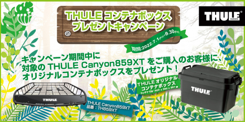 キャンペーン期間(2022年7月1日~9月30日まで)に、THULE Canyon859XT(品番:TH859XT)をご購入頂いたエンドユーザー様に、THULEオリジナルコンテナボックスをプレゼントいたします。
