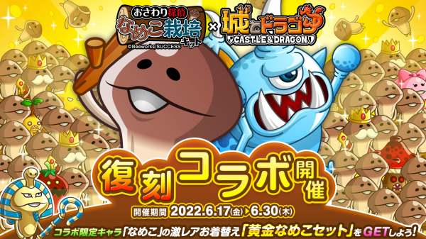 株式会社アソビズム(本社:東京都千代田区、代表取締役:大手智之)は、App Store・Google Playにて好評配信中の『城とドラゴン』で、2022年6月17日(金)より株式会社ビーワークスならびに株式会社サクセスの『おさわり探偵 なめこ栽培キット』(以下、『なめこ栽培キット』)との復刻コラボイベントを開催いたします。