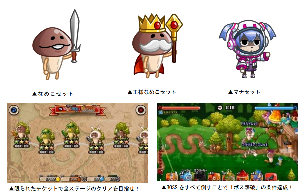 コラボ開催期間中、1日3枚配布される“ひとりで”のチケット消費で、バトル内の「SP討伐イベント」から、コラボSP討伐イベント「なめこ栽培キット×城とドラゴン」に挑戦できます。討伐イベントは敵の城を落城させないとステージクリアとならない特別ルールとなっており、 “初級”から“上級”へと進む難易度別のステージへとクリアしていくことで、剣士用の限定お着替え“なめこセット”“王様なめこセット”“マナセット”やゲーム内アイテムが獲得できます 。