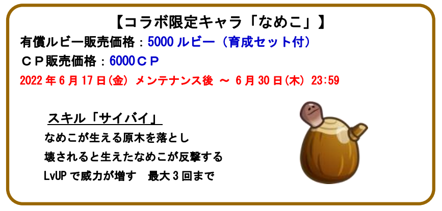 6月17日(金)メンテナンス後より、『なめこ栽培キット』とのコラボイベントが復刻開催されます。期間中は、コラボ限定キャラ“なめこ”が再登場! また、新たなお着替えや豪華アイテムが手に入る多数のコラボイベントのほか、「ログインボーナス」なども同時開催されます。