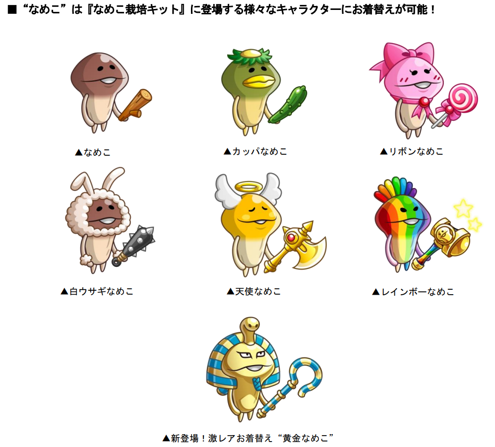 EGGショップに、コラボ限定キャラ「なめこ」が再登場! 研究開発を行なうことで、“カッパなめこ”や“リボンなめこ”“天使なめこ”などの『なめこ栽培キット』の人気キャラクターにお着替えできます。また、レアアバターチケットとの交換で“レインボーなめこ”にもお着替えできます。さらに今回のコラボでは新たに激レアお着替え“黄金なめこセット”がアバたまに追加されます。