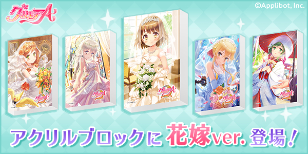ジューンブライドの季節に合わせて花嫁衣装のアクリルブロックが登場です!「花嫁」衣装は、ファンならば必ず手に入れておきたいアイテムです!是非この機会に推しキャラのアクリルブロックを存分にお楽しみください。