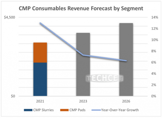 ビジネスと技術情報を提供する電子材料アドバイザリー会社TECHCETは、半導体向けCMP(Chemical Mechanical Planarization)消耗品市場が2021年に約13%成長し、30億米ドルに達したと発表しました。スラリーとパッド両方を含むCMP市場は、2022年に約9%成長して33億米ドルに達し、2026年までの予測で年平均6%以上の成長率を示しています。