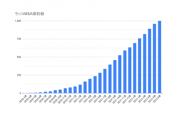 2022年6月にラッコM&Aの累計成約数は1000件を突破いたしました。2021年7月に月間成約数50件を達成して以来、安定的に月60件を超える成約数を維持しています。また、2022年4月には初めて月間成約数70件を突破いたしました(2022年4月成約数:71件)。