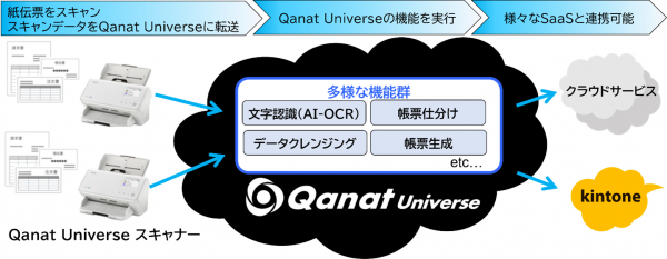 その結果、「Qanat Universe」で提供される多様な機能と組み合わせ、データを既存のシステムと連携して活用することができます。例えば、“AI-OCR機能”を利用して文字データを抽出し、“データクレンジング機能”の名寄せ処理でデータを整備して、サイボウス社のkintoneにデータを保存するといった一連の処理が可能です。「Qanat Universe スキャナー」と、別途Qanat Universeで提供される機能を組み合わせることで、開発コストを大幅に削減し、紙伝票のクラウド活用を簡単・短期間で実現します。