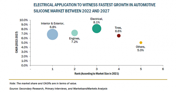 自動車用シリコーンの市場規模は、2022年の22億米ドルからCAGR7.1%で成長し、2027年には31億米ドルに達すると予測されています。新興国における自動車用シリコーンの需要増と輸送産業の成長が市場を牽引しています。