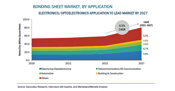 ボンディングシートの市場規模は、2022年の3億8,600万米ドルからCAGR7.4%で成長し、2027年には5億5,100万米ドルに達すると予測されています。様々なアプリケーションからのボンディングシートに対する需要や、政府のインセンティブやスキームが同市場を牽引しています。