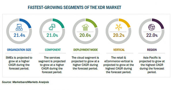 XDR(拡張型検知応答)の市場規模は、2022年の9億8,500万米ドルからCAGR19.1%で成長し、2027年には23億5,800万米ドルに達すると予測されています。サイバー攻撃の規模が拡大していることから、XDRソリューションのニーズが高まっています。組織は、サイバー脅威の状況を可視化するソリューションを求めており、SIEMや従来のEDR、あるいはMSSPによるセキュリティの成果には満足していないため、XDRソリューションを検討しています。XDR の成長率は、エンドポイントのみならず、クラウド、モバイルデバイス、およびユーザー ID 全体でセキュリティ脅威を検出することに起因しており、複雑な攻撃を検知・特定するための高度な分析(AIやML)など、XDRが提供する機能の可能性が期待されています。