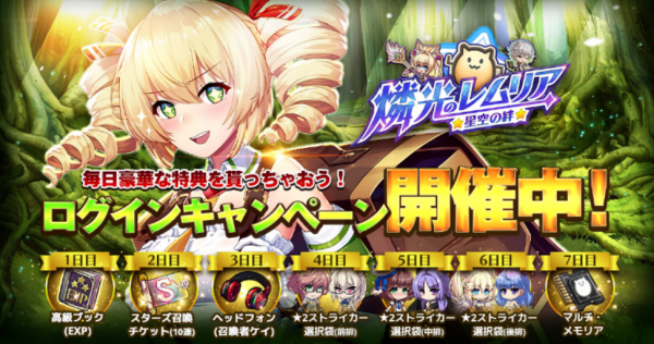 「ログインキャンペーン」では、「経験値アイテム」「スターズ召喚チケット(10連)」集めるとキャラクターと交換できる「メモリア」など、さまざまな豪華アイテムが手に入りますので、毎日ログインしてくださいね♪