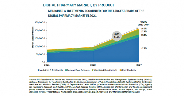 デジタル薬局の市場規模は、2022年の965億米ドルからCAGR17.0%で成長し、2027年には2,119億米ドルに達すると予測されています。同市場の成長は、COVID-19パンデミック状況下およびその後のオンライン医薬品購入に対する消費者の嗜好の高まり、市場の統合やパートナーシップ、高齢者人口の増加などが要因となっています。