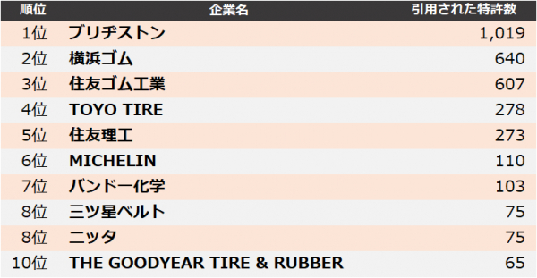 集計の結果、2021年に最も引用された企業は、1位 ブリヂストン、2位 横浜ゴム、3位 住友ゴム工業となりました。
