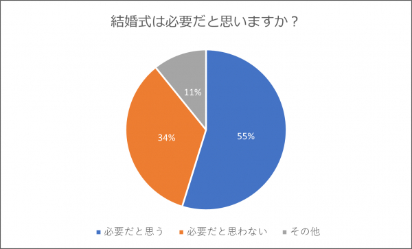 「必要だと思う」と回答した人は全体の54.8%、「必要だと思わない」は34.4%、「その他」は10.8%でした。さまざまな結婚式のカタチが生まれる現代においても、多くの人が結婚式を「喜びの儀式」として大切にしていることがわかりました。