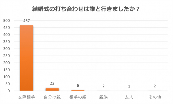 最も多かったのは「交際相手」で93.4%、「自分の親」は4.4%、「相手の親」は1.2%、「親族」は0.4%、「友人」は0.2%でした。「結婚式準備はふたりでやりたい」「パートナーと一緒にウエディングドレスを選びたい」と考える人が多いのかも知れませんね。