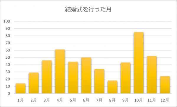 「1月」2.8%、「2月」5.8%、「3月」9.2%、「4月」12.2%、「5月」8.8%、「6月」10%、「7月」6.8%、「8月」3.6%、「9月」8.6%、「10月」17%、「11月」10.4%、「12月」4.8%という結果でした。ジューンブライドが人気だと思われがちですが、気候が穏やかな季節を選ぶ人が多いようです。