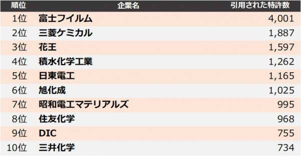 集計の結果、2021年に最も引用された企業は、1位 富士フイルム、2位 三菱ケミカル、3位 花王となりました。