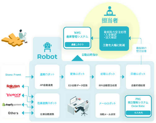 RPA(特許取得)の他4つのソフトウェアロボットでShopify、楽天、Yahoo!などの販売カート・モールから受注データをAPIで自動取得し、ロボットで出荷可能なデータに自動変換を行い、出荷指示データをWMSに連携します。