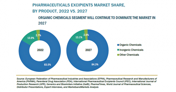 医薬品添加剤市場は、2022年の86億米ドルからCAGR5.9%で成長し、2027年には115億米ドルに達すると予測されています。ジェネリック医薬品の生産量増加と相まって、医薬品市場が急速に拡大していることが、同市場の成長を後押ししています。一方、医薬品や賦形剤の承認に関する規制の厳しさが増していることに加え、コストと時間のかかる医薬品開発プロセスが、同市場の成長を抑制するものと見られています。