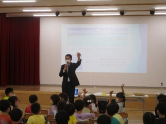 ヘチマプロジェクトは、食器洗い時にプラスチック製スポンジ等から排出されるマイクロプラスチックゴミ(以下「マイクロプラゴミ」)の排出ゼロを目指し、プラスチック製スポンジの代替品として、ヘチマたわしの利用を普及させようというSDGs活動です。同園の園児たちに対し、エサと間違えてマイクロプラゴミを食べる魚がいることや、それに伴い、人間への健康被害が想定されることなど、クイズを織り交ぜながら説明を行いました。(左側の写真)