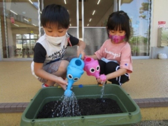 その後、園児たちとヘチマの種を同園内のプランターに植え、水やりを行いました。(右側の写真)