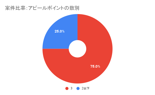 案件のアピールポイント(最大3つ)を3つとも書いている案件は、2つ以下の案件に比べ10ポイント近く成約率が高くなっています(アピールポイントが3つの案件の成約率:46.2%、2つ以下の案件:36.8%)。