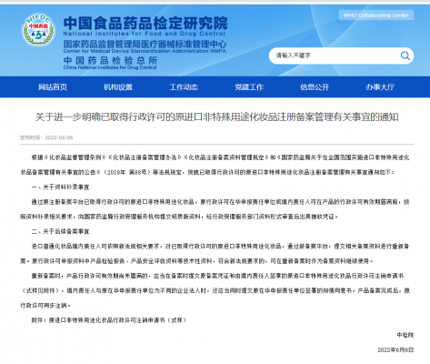 株式会社ワールドワイド・アイピー・コンサルティングジャパン (以下「WWIP」 : 東京都港区)は、2022年6月6日、中国食品薬品検定研究院(中検院)が公開した、行政許可を得た輸入非特殊用途化粧品の登録・登記管理に関する通知を翻訳し、重要なポイントを下記にまとめ、6月27日より公表しました。