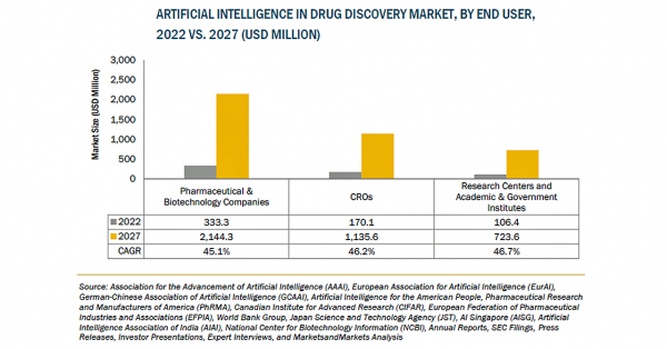創薬におけるAI市場は、2022年の6億米ドルからCAGR45.7%で成長し、2027年には40億米ドルに達すると予測されています。創薬コストの抑制や創薬プロセスにかかる時間短縮のニーズ、クラウドベースのアプリケーションやサービスの採用の増加、ブロックバスター薬の特許期限などが、市場の成長を促進する要因となっています。