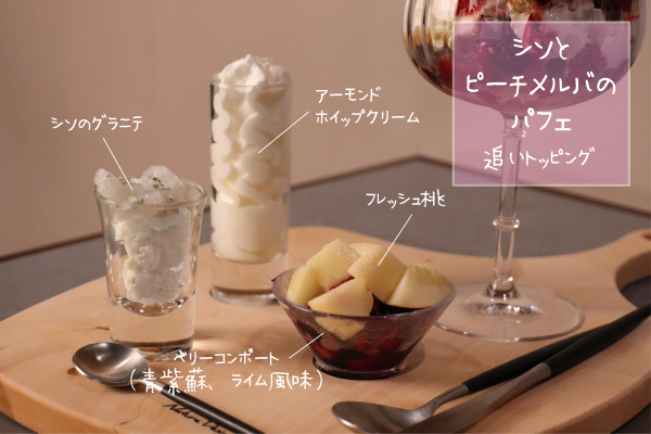 さらにシソのグラニテを合わせ、暑い季節にも清涼感を感じさせる、どこか和風なピーチメルバのパフェに仕上がりました。