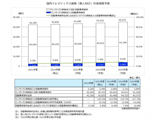 国内の個人向けテレマティクス保険市場は2022年度に2,490億円、自動車保険料全体に占めるテレマティクス保険加入の自動車保険料の割合は5.8%の見込みとなり、2025年度には同3,895億円、及び同8.6%に達すると予測する。2021年度から2025年度までのCAGR(年平均成長率)は14.6%で成長していく見通しである。