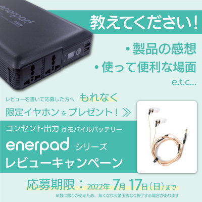 株式会社リンクスインターナショナル(本社:東京都千代田区、代表取締役:川島義之)は、コンセント出力付モバイルバッテリー「enerpad」シリーズをレビューすると限定イヤホンがもらえる、「enerpad シリーズ レビューキャンペーン」を2022年6月29日から2022年7月17日まで開催いたします。