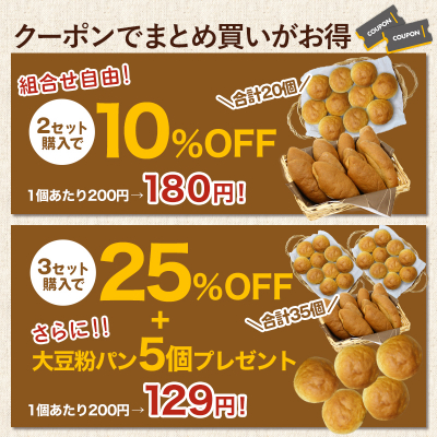 さらに3セット購入の場合25%OFFクーポン+大豆粉パン5個プレゼントを実施中です。