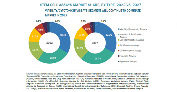 幹細胞アッセイの市場規模は、2022年の19億米ドルからCAGR17.7%で成長し、2027年には45億米ドルに達すると予測されています。幹細胞アッセイ市場の成長は、幹細胞の治療能力に関する認知度の向上、幹細胞研究への資金提供の増加、創薬における細胞由来アッセイの需要の高まり、市場プレーヤー同士の提携や合意といった要因に起因しています。