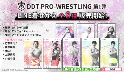 株式会社インクルーズ(東京都渋谷区、代表取締役社長 山﨑 健司)は、LINE株式会社(東京都新宿区、代表取締役社長 出澤 剛)が運営するコミュニケーションアプリ「LINE」内のLINE着せかえにて、「DDTプロレスリング」のLINE着せかえ8点を2022年7月4日(月)に販売開始致しました。