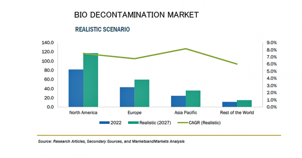 バイオ除染の市場規模は、2022年の1億5,900万米ドルからCAGR7.3%で成長し、2027年には2億2,700万米ドルに達すると予測されています。同市場の成長は、HAI(院内感染)の増加や外科手術の増加、世界的な製薬・バイオテクノロジー産業の成長によってもたらされています。