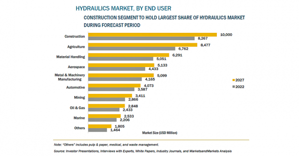 油圧機器の市場規模は、2022年の412億米ドルからCAGR3.8%で成長し、2027年には497億米ドルに達すると予測されています。建設産業の潜在的な成長、マテリアルハンドリング機器の需要増加、プロセス産業の拡大などが、同市場の成長を促進する要因となっています。さらに、技術進歩によるスマート油圧機器の需要増加も、その成長を後押ししています。