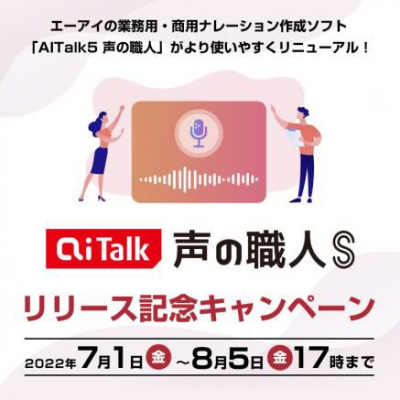 エーアイは、発売を記念したキャンペーンを実施し、新製品「AITalk5 声の職人S」を含むナレーション作成ソフトを7月1日~8月5日までの間、特別価格で提供いたします。