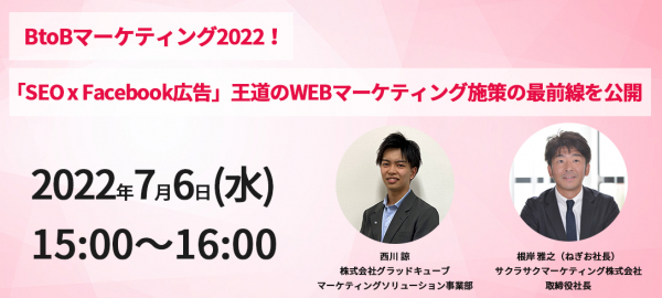 株式会社グラッドキューブ(本社:大阪市中央区 代表取締役 CEO 金島 弘樹 以下:グラッドキューブ)はサクラサクマーケティング株式会社(本社:東京都渋谷区、代表:根岸 雅之)と共催で、7月6日(水) 15:00~ 王道の WEB マーケティング施策をテーマにオンラインセミナーを開催いたします。