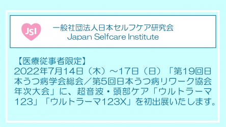 一般社団法人日本セルフケア研究会は、2022年7月14日(木)・7月15日(金)に開催される「第19回日本うつ病学会総会」、7月16日(土)・7月17日(日)に開催される「第5回日本うつ病リワーク協会年次大会」に、超音波・頭部ケア「ウルトラーマ123(超音波振動子の数:2個)」「ウルトラーマ123X(超音波振動子の数:4個)」を初出展いたします。