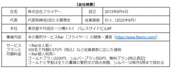 株式会社フライヤーは、本の要約サービス「flier(フライヤー)」を運営する、ITベンチャー(2013年6月設立)です。最大の特長は「書評(レビュー)」ではなく「要約」である点です。書き手の主観が入る書評とは異なり、著者の主張や論理(重要ポイントや全体像)を忠実にまとめ、読者に伝えます。書評でないため、出版社と著者から要約の許可を得る必要があり、要約した原稿にも目を通していただくことで、高品質なサービスを提供しています。