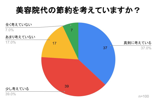 「美容院代の節約を考えていますか?」の質問では、『真剣に考えている』が37%、『少し考えている』が39%、『あまり考えていない』が17%、『全く考えていない』が7%という結果となり、76%の人が節約を考えていると回答しました。