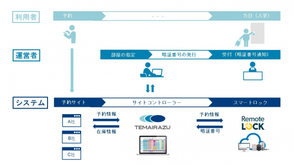 従来ですと、部屋番号の割当てと解錠キーの発行・管理は、PMS(プロパティマネジメントシステム)とRemoteLOCK間で行われるか、PMSを利用していない宿泊施設ではRemoteLOCK上で管理するしかできませんでした。今回の連携により、宿泊施設は、TEMAIRAZU内の予約情報とRemoteLOCKの解錠キーを合わせてTEMAIRAZU上で管理することができ、管理の煩雑さを省き業務の効率化を図ることができます。